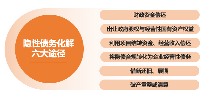 根據2018年8月財政部印發的《地方全口徑債務清查統計填報說明》第十五條,隱性債務化解包括六大途徑: